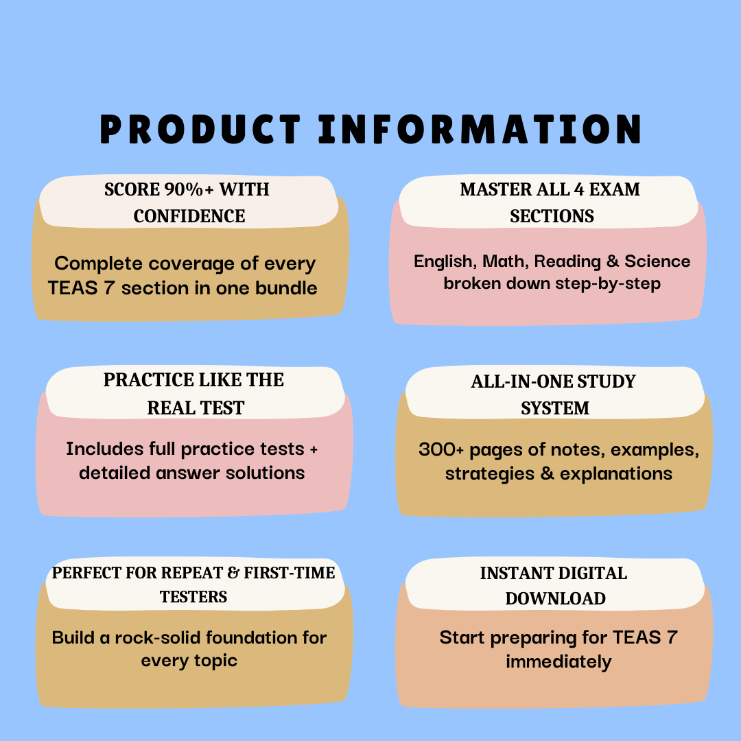 This 300+ page digital bundle provides in-depth coverage of all four TEAS sections—Reading, Mathematics, Science, and English & Language Usage—along with proven test-taking strategies, time management techniques, and common question traps.